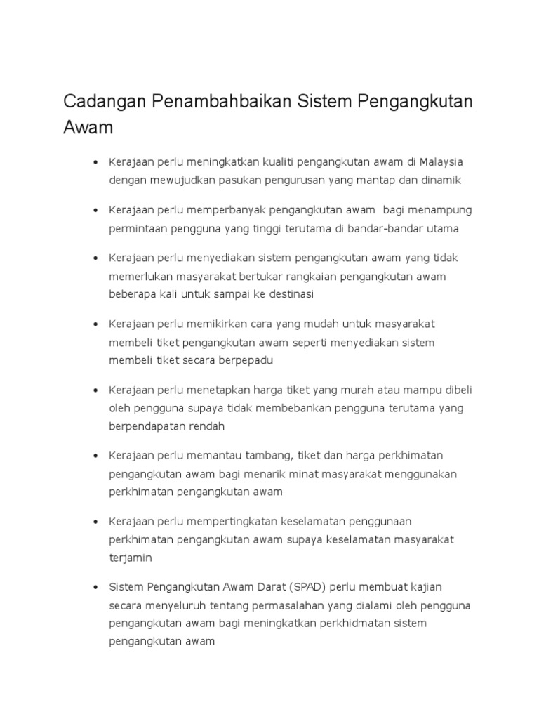 Berikut adalah cadangan penambahbaikan sistem pengangkutan awam yang dapat dijadikan panduan dan rujukan kepada pelajar semua menyiapkan. Ve to delete the image and then penambahbaikan;penambahbaikan; Awam adalah melalui penambahbaikan dalam aspek. Cadangan penambahbaikan pengangkutan awam menyeluruh melalui. Menteri pengangkutan, datuk seri dr.